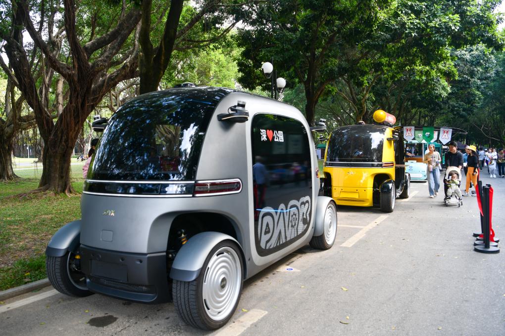 這是2024年11月11日在深圳蓮花山公園拍攝的無(wú)人駕駛觀光車、零售車。新華社記者 梁旭 攝