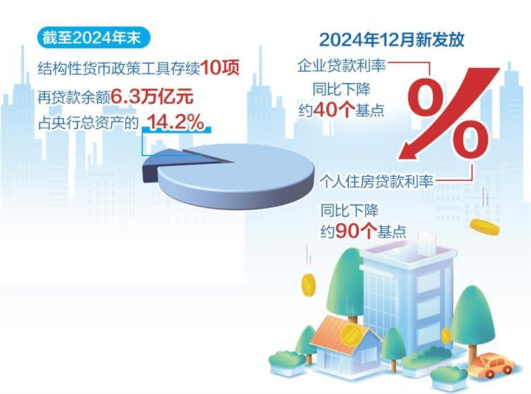 比如,近年來央行根據(jù)經濟結構調整需要創(chuàng)設了一系列再貸款工具,激勵引導金融機構向重大戰(zhàn)略、重點領域和薄弱環(huán)節(jié)提供金融服務。報告顯示,截至2024年末,結構性貨幣政策工具存續(xù)10項,再貸款余額6.3萬億元,占央行總資產的14.2%,支持范圍基本覆蓋金融“五篇大文章”。