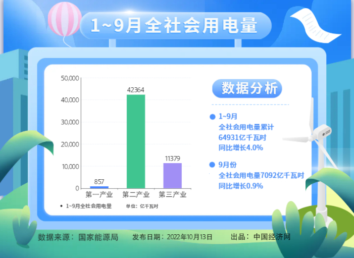 9月份,全社會用電量7092億千瓦時,同比增長0.9%。